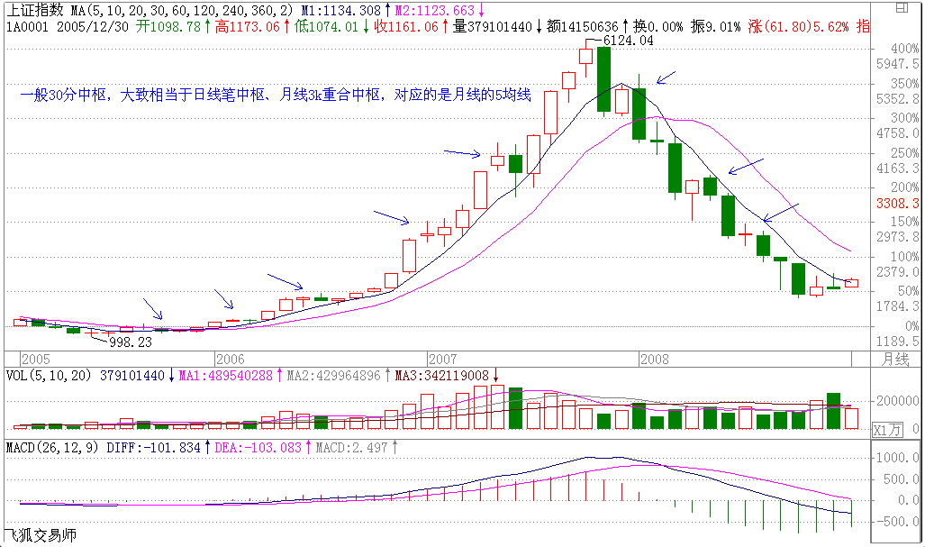 大走势,就是月线的5均线,今天盘中假突破,而且还是3434点一般的位置,这不难看出来。(5/31解盘:其实,纯技术上,现在的大走势并不坏,六月的调整没什么可说的,本ID那1/2线,现在也在4144点了,下面,这次上涨1/3的位置在3734点,这位置是第一支持位。没有特别的事情,这位置有很强支持。否则就要考验一半的位置,3434点。但至少现在,没有任何看到该位置的理由。(备注:从0206的2541开始算,一般30分中枢大致相当于日线笔中枢、月线3k重合中枢,对应的是月线的5均线)