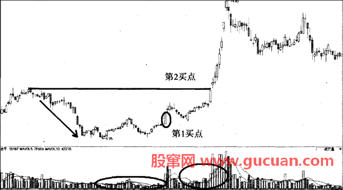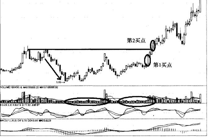 主力在横盘整理的末端,突然“挖坑洗盘”,而在“洗盘坑底”,该股主力进行了两个多月的建仓,在图中两个圈处的量能区间都走出“连续红量”,在K线图上也是“阳多阴少”,而且“量价配合”,每当上涨就放量,每当下跌就缩量,主力建仓明显!在洗盘坑的右侧,主力利用“台阶式连续红量”放量拉升股价启动主升浪 , 投资者可在谷底右侧第一根放量阳线处介入,这是第一买点,也可以在突破颈线位加仓,这是第二买点!