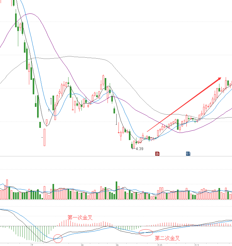 股价经过一轮下跌后开始反弹,在MACD上此时会形成金叉,第一次金叉可能只代表股价仅仅是反弹,买入不是很安全。再等反弹结束时,MACD第二次形成金叉,此时介入则就安全的多了,可以试探性建仓。什么时候确定整体走势了,再来真正的加重仓位。注:第二次金叉的位置最好比第一次金叉的位置高。