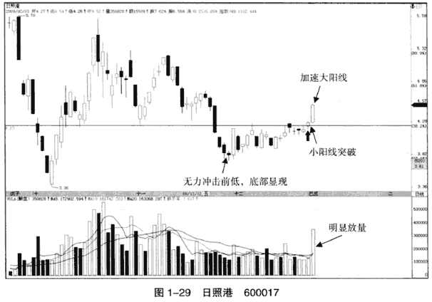 (6)如果加速看涨大阳线出现在下跌趋势中,应密切关注,准备迎接底部的到来。