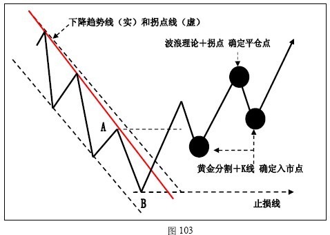 图 103 是我们在趋势交易法中由下降趋势转为上升趋势过程中,K 线的具体应用的示意图。