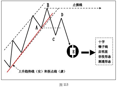 图 109 是假定价位在理论目标或拐点线处(E 点)形成K 线反转形态后展开回调走势,我们已经获利平仓,等待回调后再次买入。