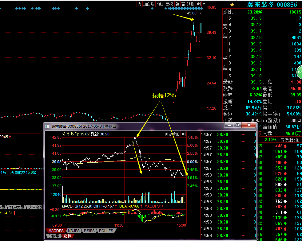 冀东装备2017/5/24,冀东装备午后震荡上升,随后大幅跳水,全天振幅达12%,这是资金大幅出逃的迹象,结合上述三条,龙头个股短线上升末期,出现这样的形态,大概率见顶了。
