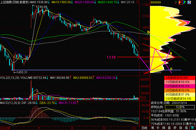 经过这么科学地分析以后,我们估计从c点向下突破原来的低点创新低,这只是时间问题,这种趋势是存在的,而且这一轮反弹造成的麻烦是什么呢?就是1530点这个区间又堆积了一堆套牢筹码,指数以后再要回上来,又会比较麻烦。
