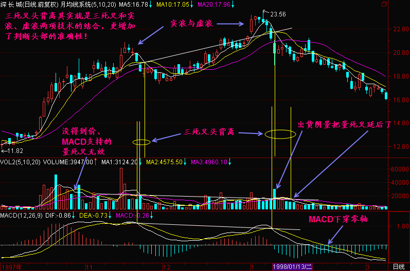 这就构成了三死叉见顶的图形,价死叉位置抬高,而量死叉、MACD死叉位置降低。