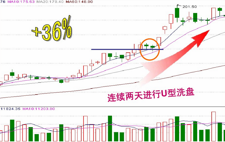 “U”型洗盘的重心大多向下,其主要目的是想洗出获利盘;拱形洗盘的重心大多向上,其主要目的是想洗出套牢盘——两者区别是:拱形洗盘往往在K线形态的颈线处,成交量放得较大;而“U”型洗盘则多为上升通道中,成交量不是很大。