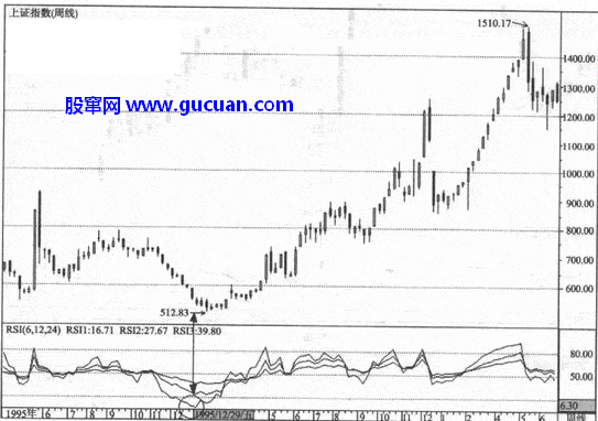 大盘跌到1000点的时候,周线RSI跌至15以下,这里明显构筑了重要的底部位置(如图所示)