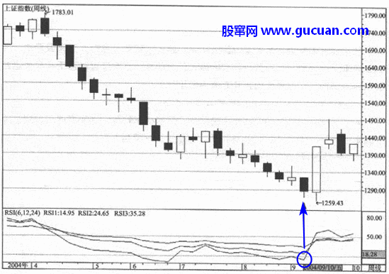 直到上涨指数经过长期的下跌和调整,RSI值再次小于15,此时跌幅已深,已基本符合操作要求的三个要素条件,因此形成新一轮行情的重要底部位置(如图所示)